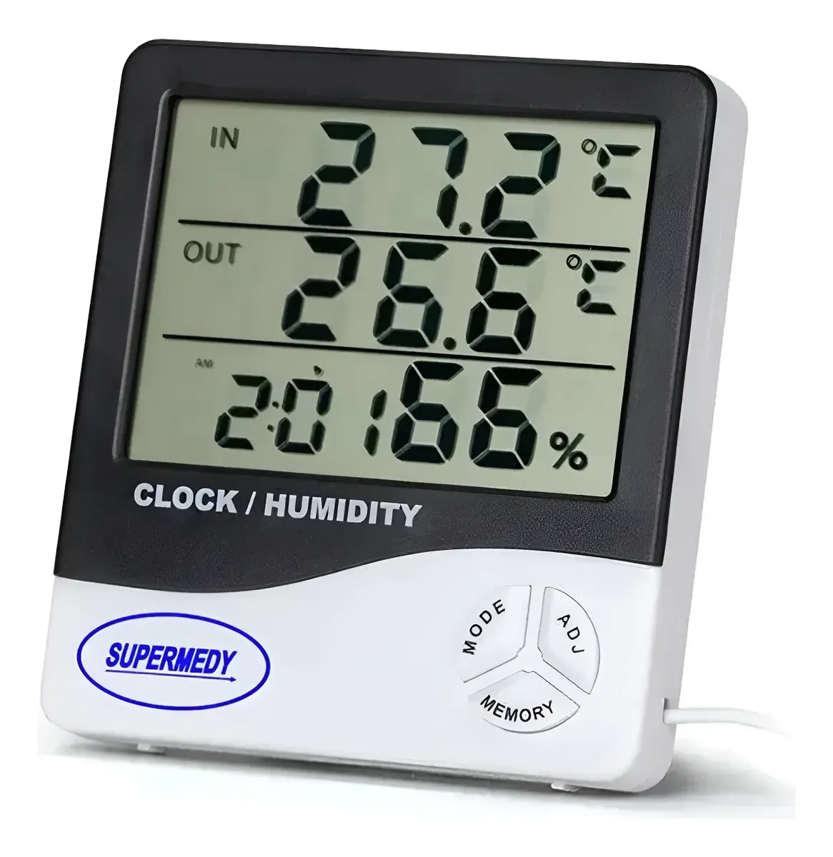 O Termo Higrômetro Digital Supermedy é um dispositivo multifuncional projetado para monitorar as condições ambientais com precisão. Ele combina quatro funções essenciais em um único aparelho compacto: termômetro, higrômetro, relógio digital e despertador.